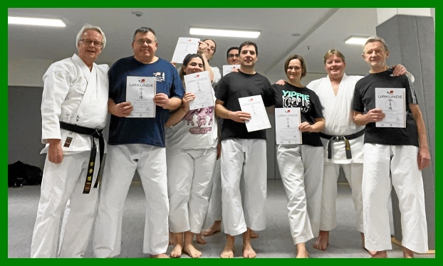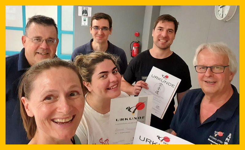 Nach erfolgreichem Start der Kyusho-Jitsu-Gruppe im April konnten am 25.07.2023 die ersten sechs Karateka ihre Prüfungsurkunden zum Weiß- und Gelbgurt aus den Händen der beiden Trainer und Prüfer Thomas Abold und Bernd Heubeck entgegennehmen. Vorausgegangen war eine umfassende Wissensabfrage in Historie und Grundlagen (Polaritäten, Elemente, Handhaltung und Stände) des Kyushu-Jitsu.
